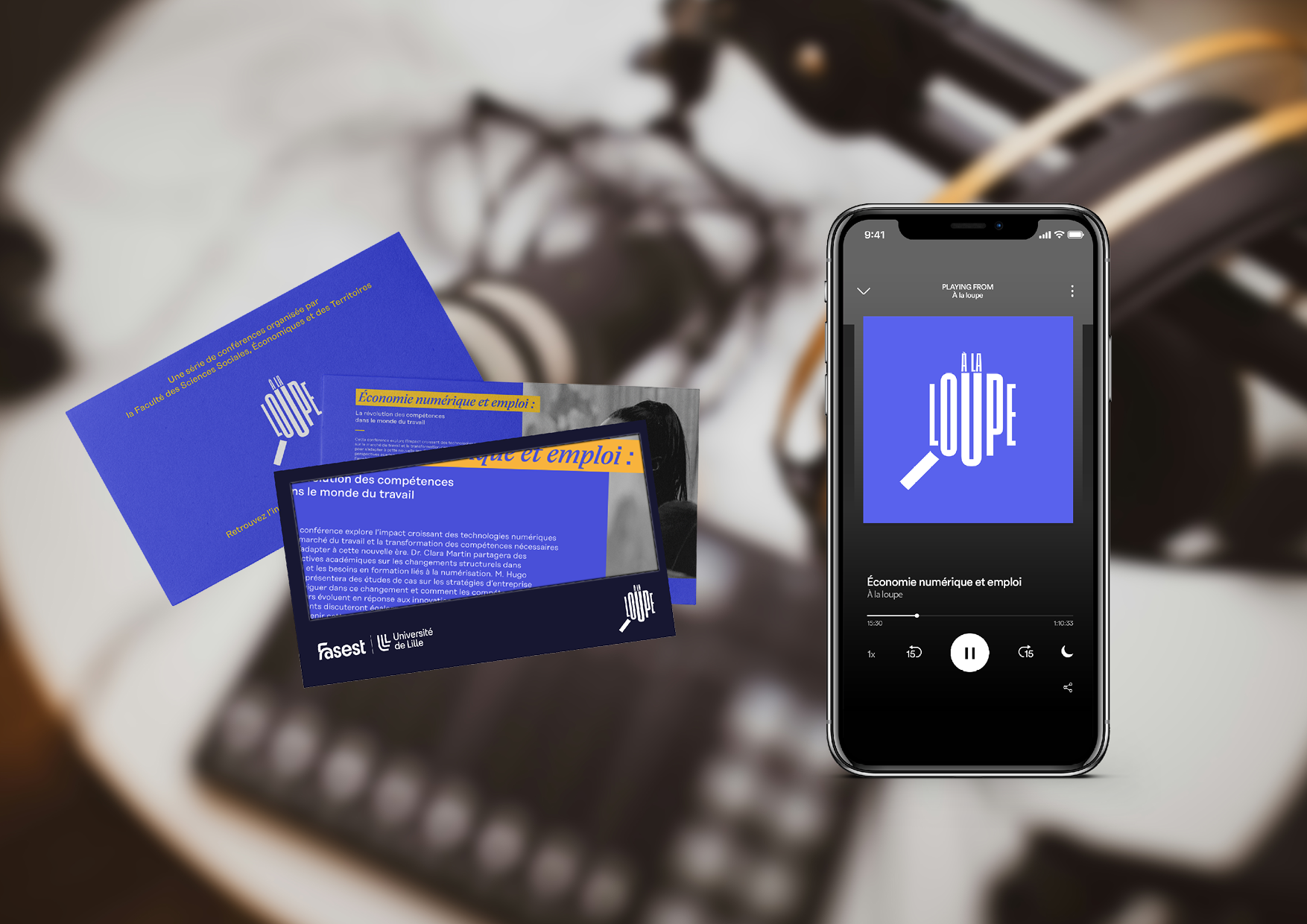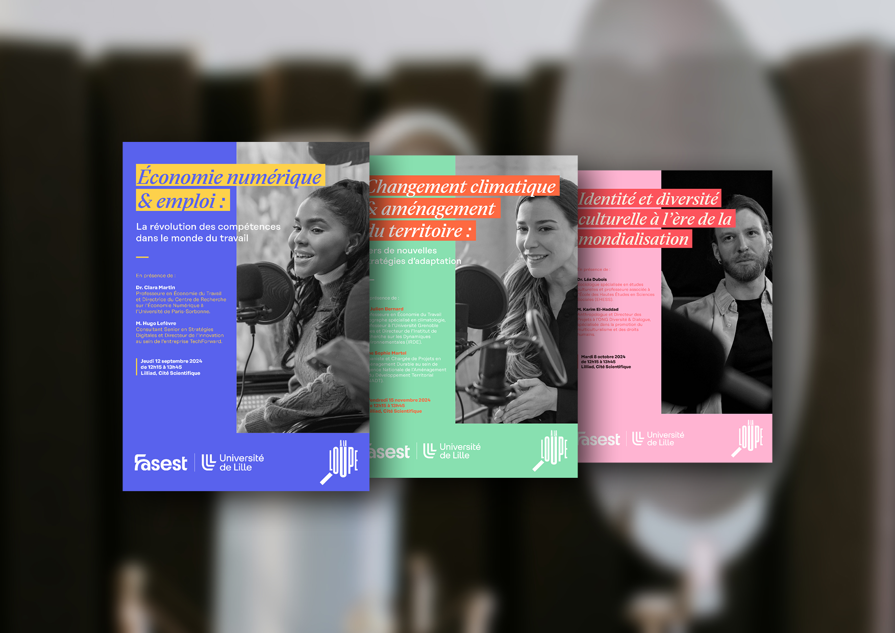 Nous décidons de proposer une retranscription des conférences sous forme de podcast. En s’appuyant sur la symbolique de la loupe, je crée une identité visuelle intègrant un marqueur ingénieux où le nom se révèle subtilement, tout en évoquant l’univers sonore du podcast.La campagne de communication, à la fois print et digitale, mise sur l’interactivité avec, par exemple des invitations décryptables… à la loupe.