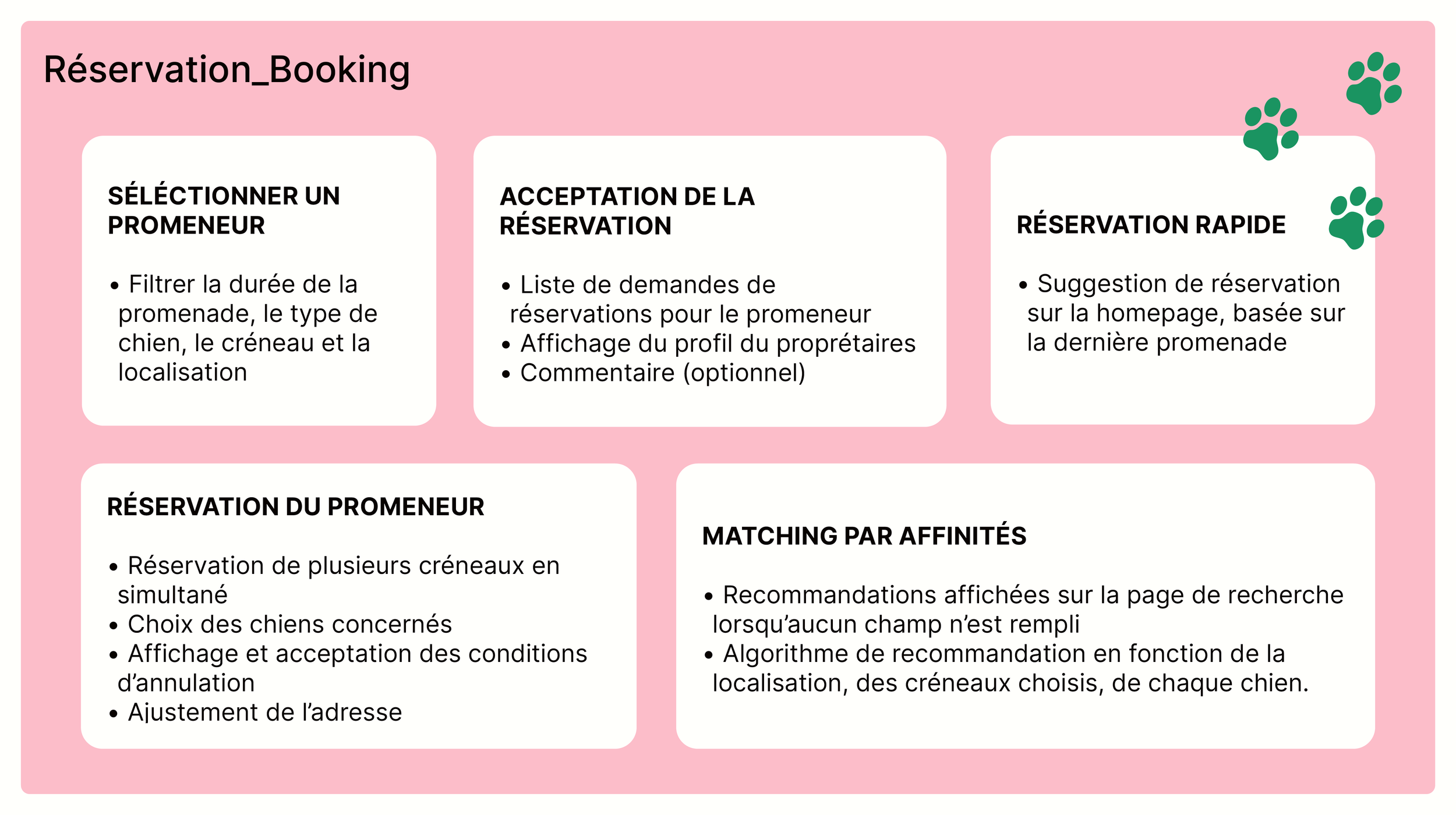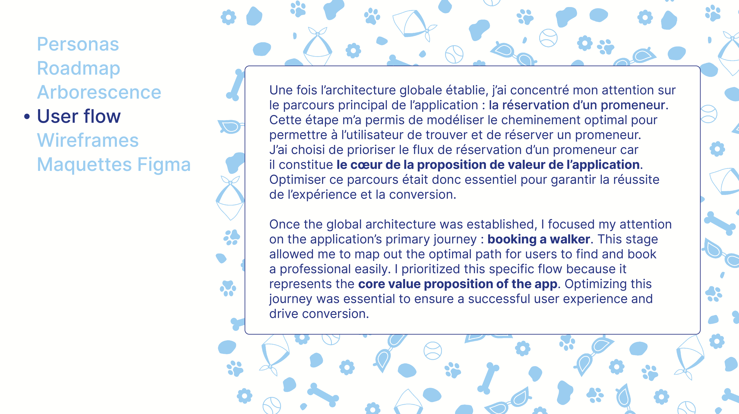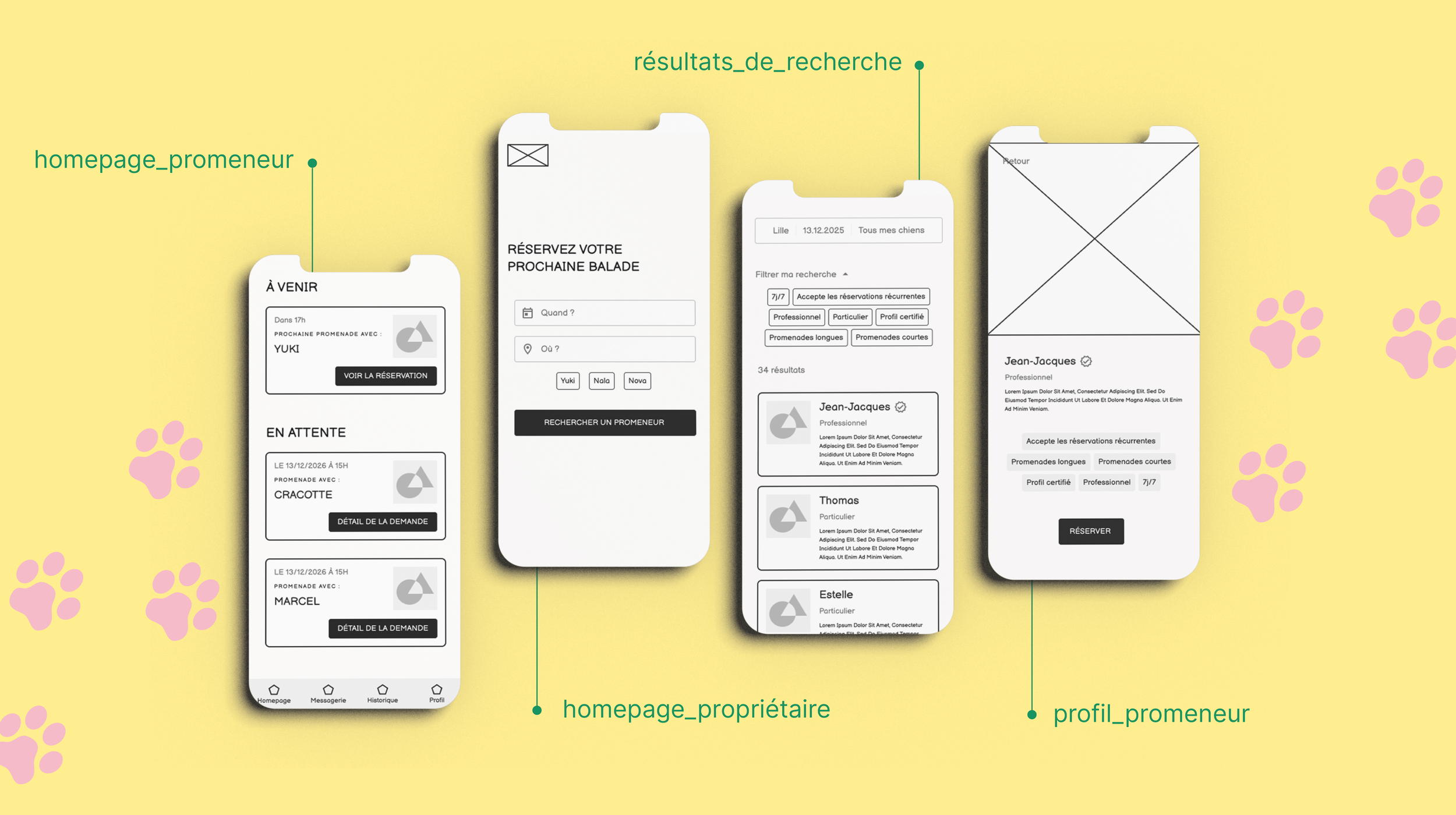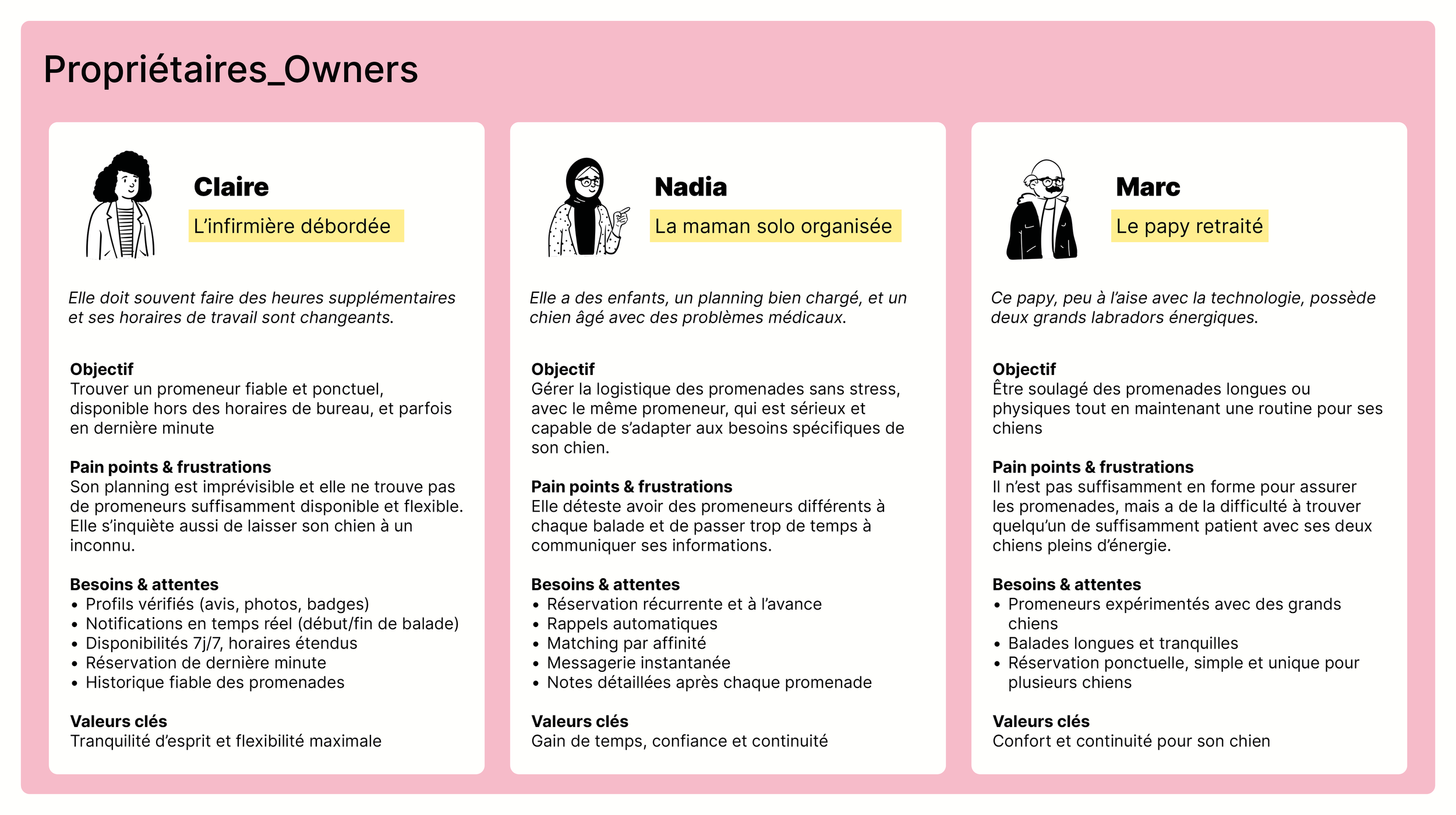 Au-delà de la simple mise en relation, comment harmoniser les contraintes logistiques des propriétaires avec les motivations variées des promeneurs ? Le challenge UX consistait à identifier les points de friction dans le parcours utilisateur : de la gestion des agendas à la transmission des besoins spécifiques du chien (santé, caractère, habitudes), afin de transformer une logistique complexe en une expérience fluide, intuitive et rassurante.