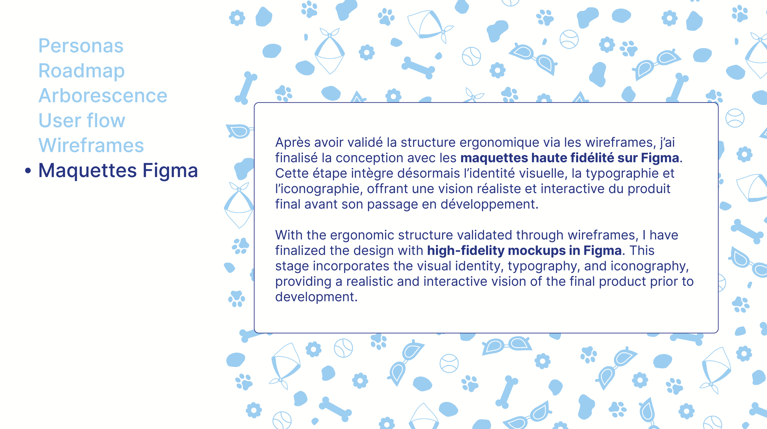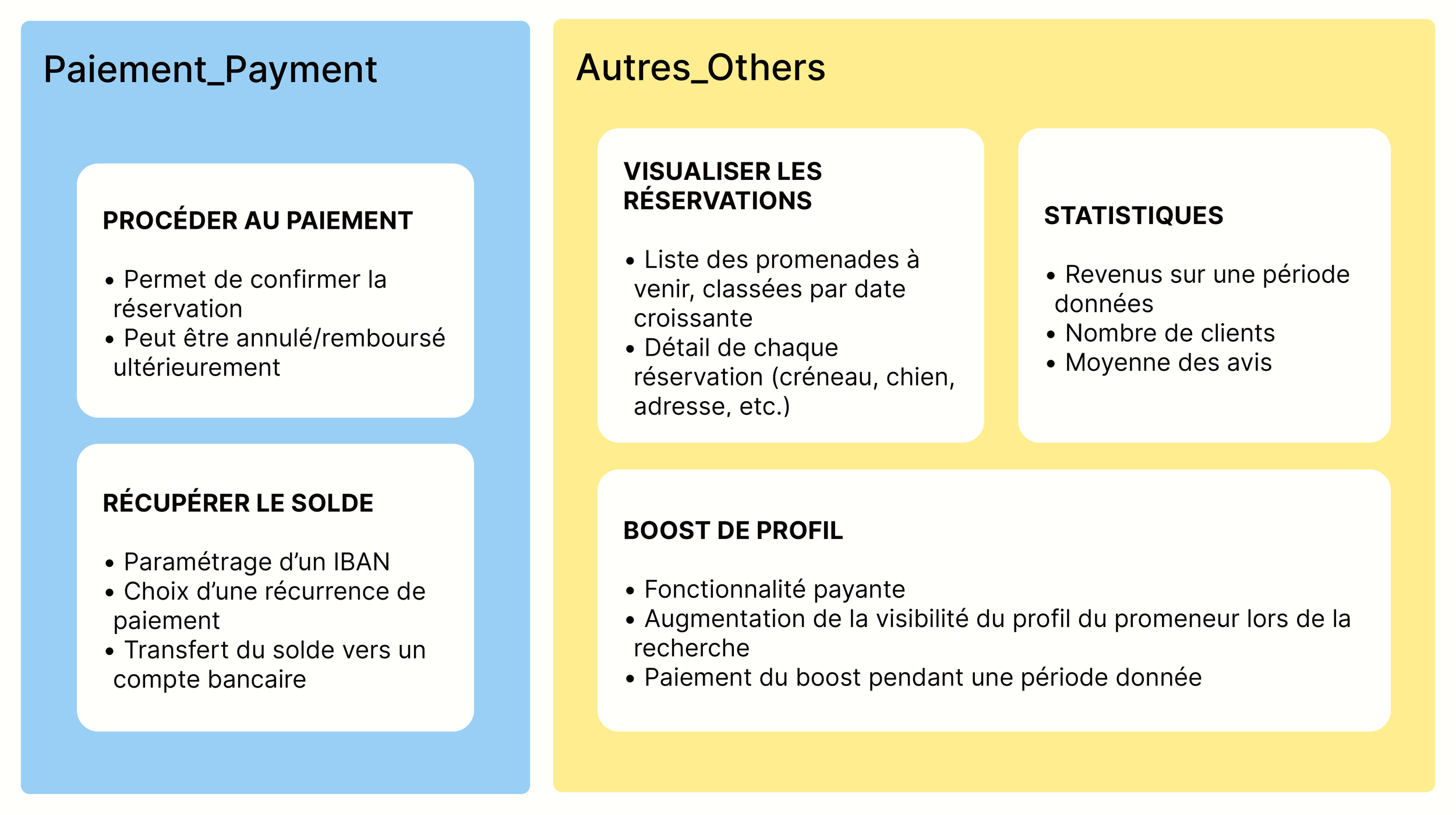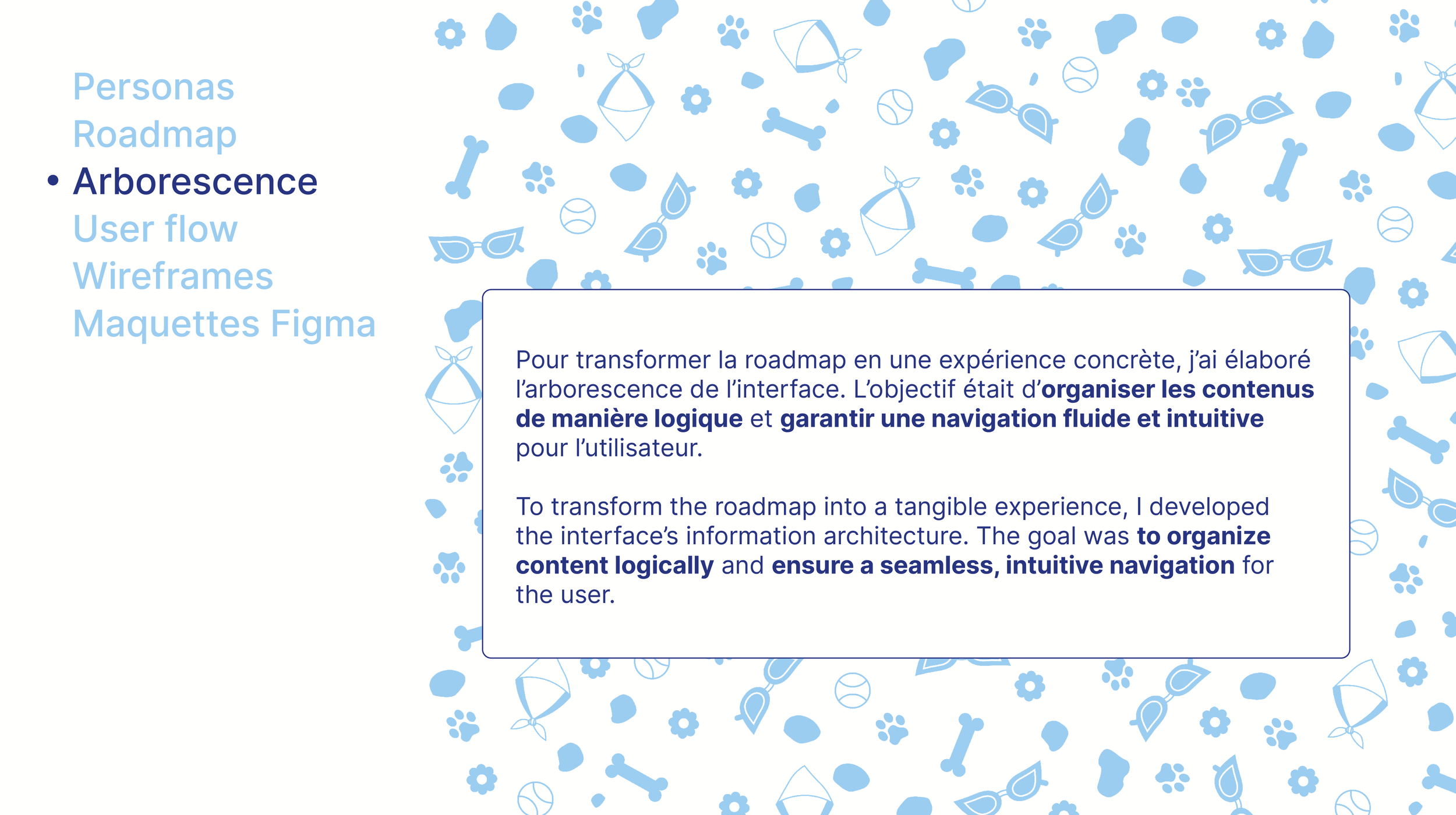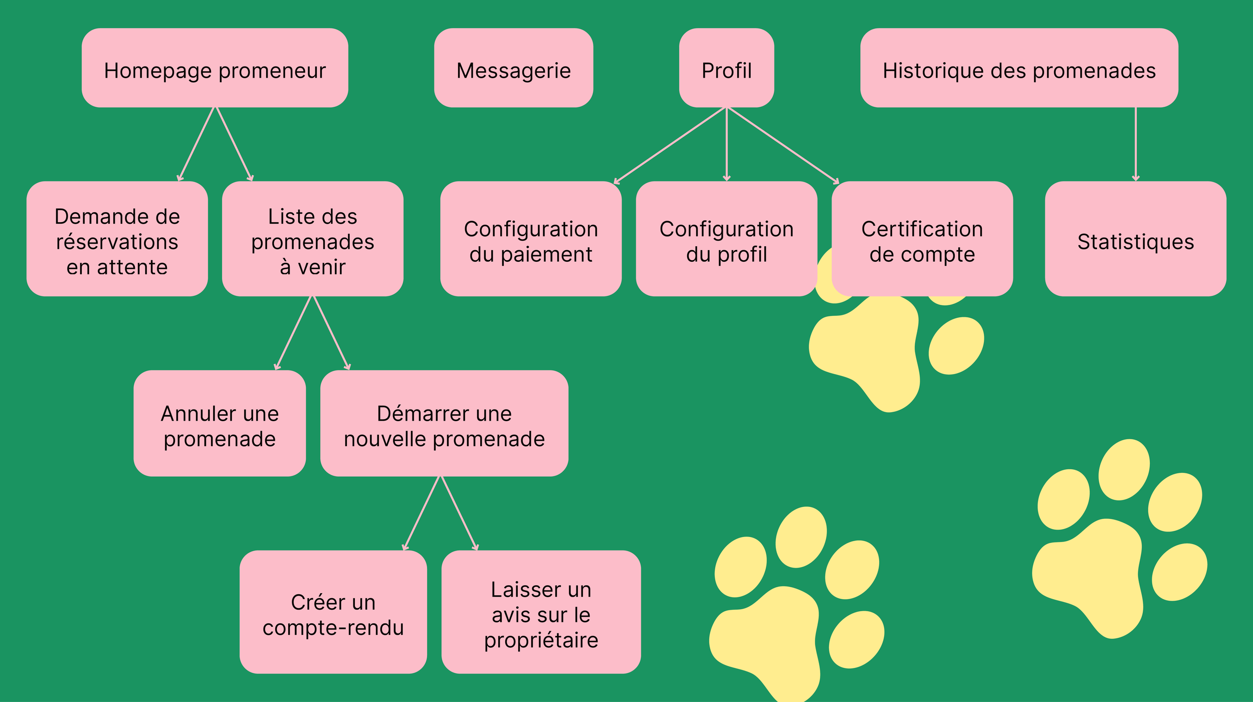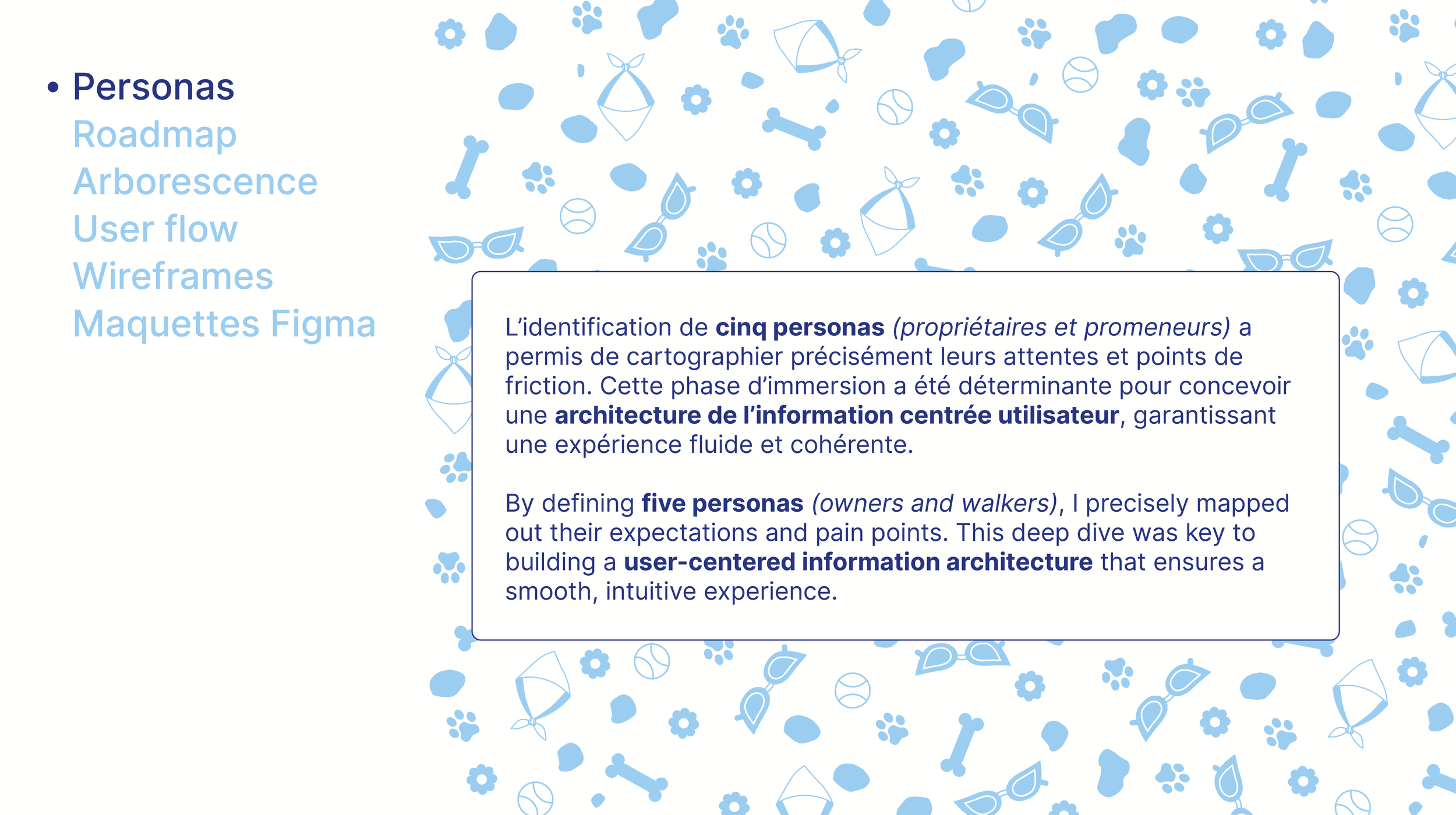Au-delà de la simple mise en relation, comment harmoniser les contraintes logistiques des propriétaires avec les motivations variées des promeneurs ? Le challenge UX consistait à identifier les points de friction dans le parcours utilisateur : de la gestion des agendas à la transmission des besoins spécifiques du chien (santé, caractère, habitudes), afin de transformer une logistique complexe en une expérience fluide, intuitive et rassurante.