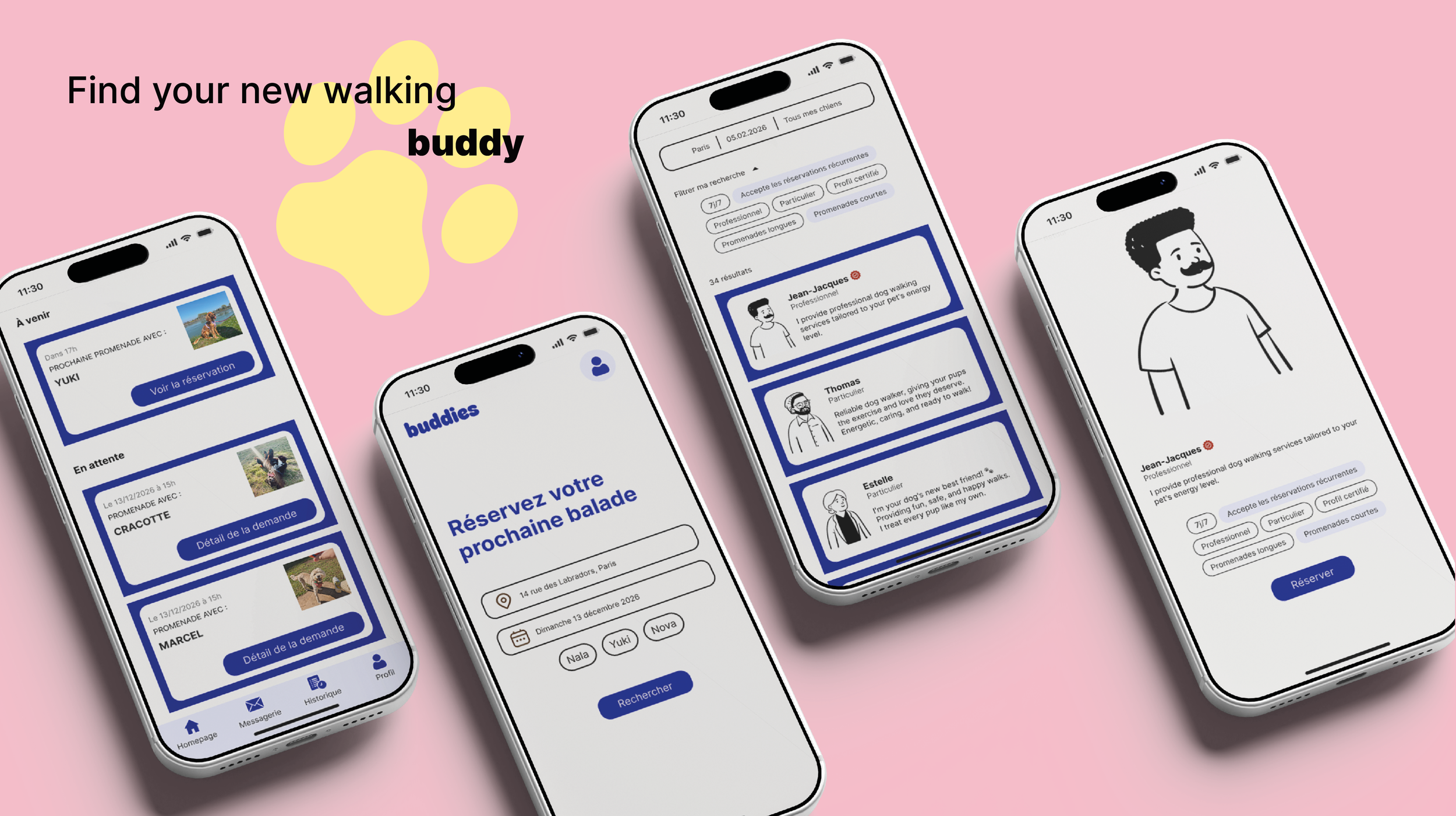 buddies est une application mobile de mise en relation entre propriétaires de chiens et promeneurs. L'objectif est d'offrir une solution de proximité flexible pour assurer l'activité physique et le bien-être des animaux, tout en s'intégrant naturellement dans l'emploi du temps souvent chargé des maîtres.