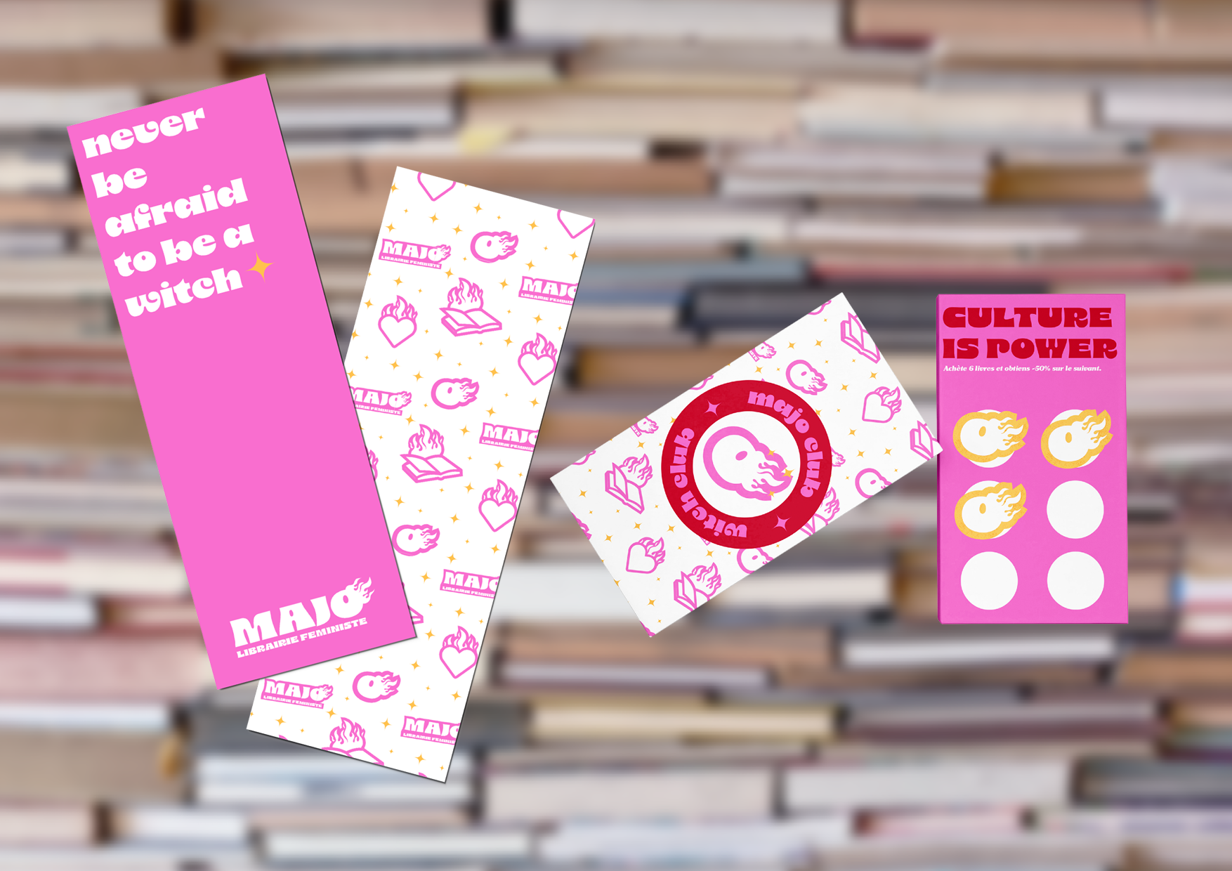 Le nom de la marque rappelle que les féministes étaient autrefois perçues comme des sorcières. Avec un rose affirmé, des couleurs audacieuses et des illustrations assumées, j’ai conçu une identité graphique moderne, qui ne s’excuse pas et s’éloigne des codes classiques du féminisme.